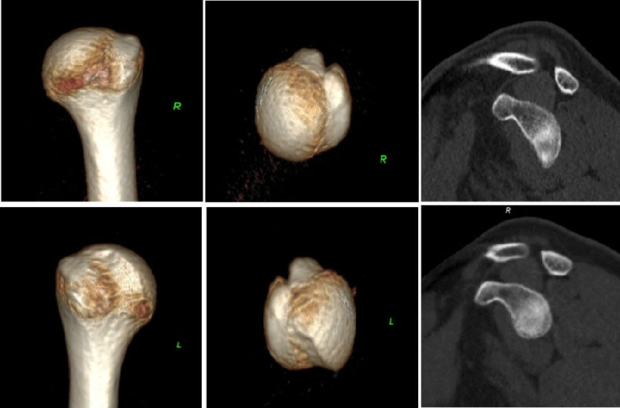 评估报告提示:右肩胛骨关节盂前下缘撕脱骨折,符合骨性bankart损伤。右肱骨头后上缘凹陷骨折,符合Hill-Sachs损伤。Hill-Sachs间隙为13.8mm(<15.3mm),为轨迹内肩关节前脱位。