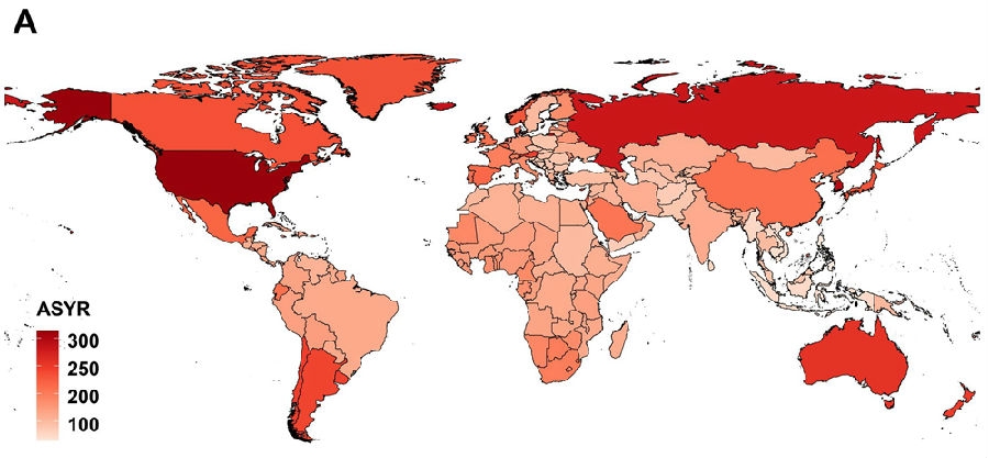 图1. 2019年全球早发OA年龄标准化YLDs率(ASYR)