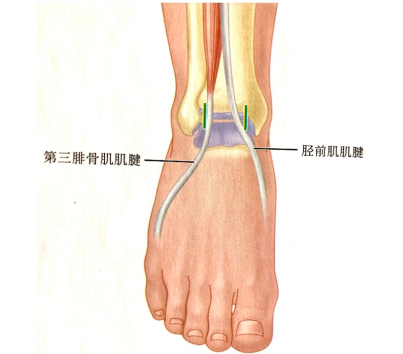 1.趾长伸肌腱,2.距骨,3.胫骨下端,4.海长伸肌腱