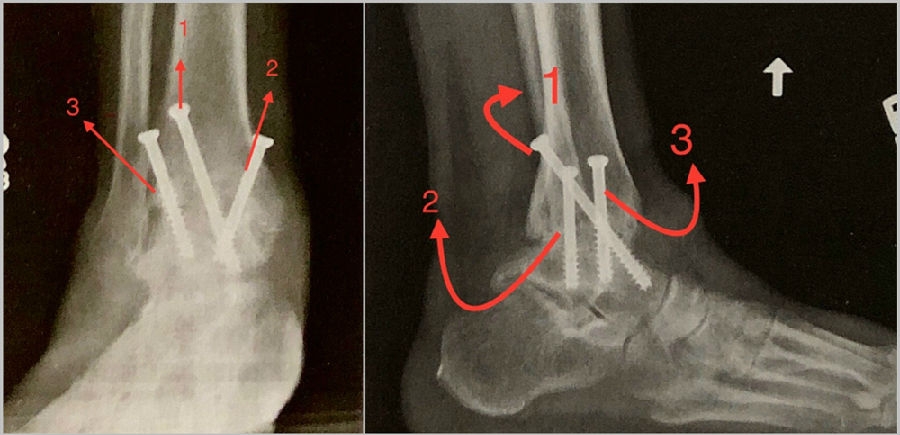 第1枚螺钉自内踝后侧向前下方向打入距骨头颈部;