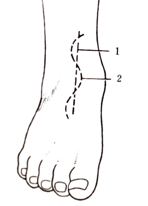 1. 平仰卧位,垫高患侧髋关节,做2个1.5cm切口,第一个位于胫前肌腱内侧,第二个位于第三腓骨肌腱外侧 。