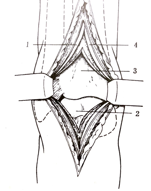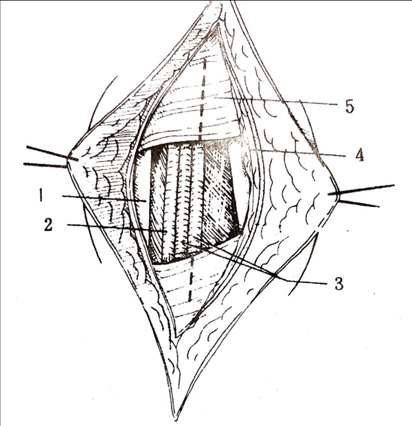 2. 切口:跟腱内缘纵形切口8CM,显露踝关节后方。切除胫距和跟距关节软骨面,从胫骨、跟骨后侧用骨凿凿数条带带的鱼鳞状骨片翻转植骨,间隙植骨。