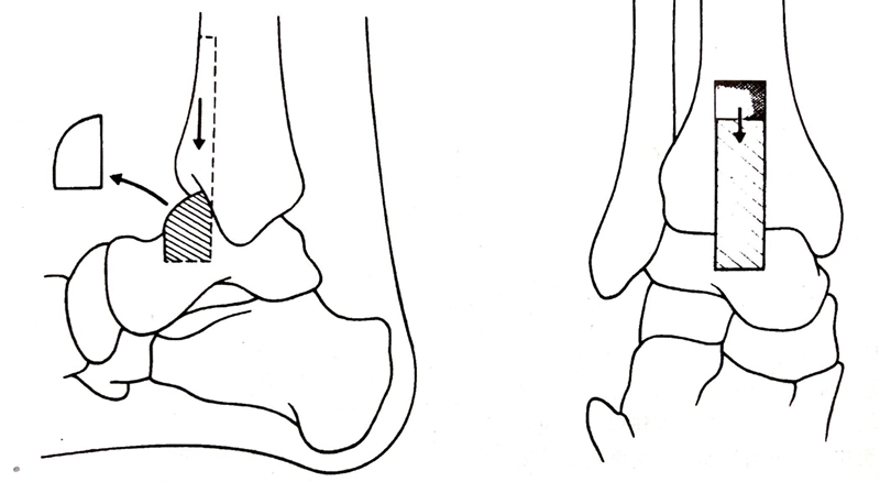 用19mm圆锯的中心对准踝关节的内侧间隙,自内踝经关节间隙钻到外侧。取出中间带关节软面的骨芯,旋转90度,由原口插入填塞骨隧道,也可取髂骨植入。
