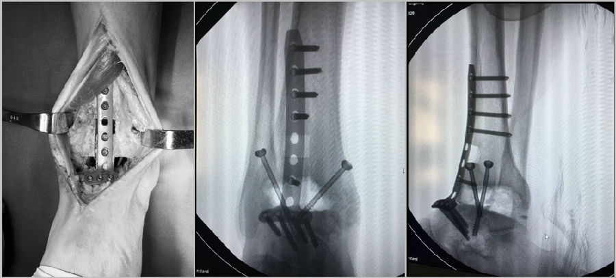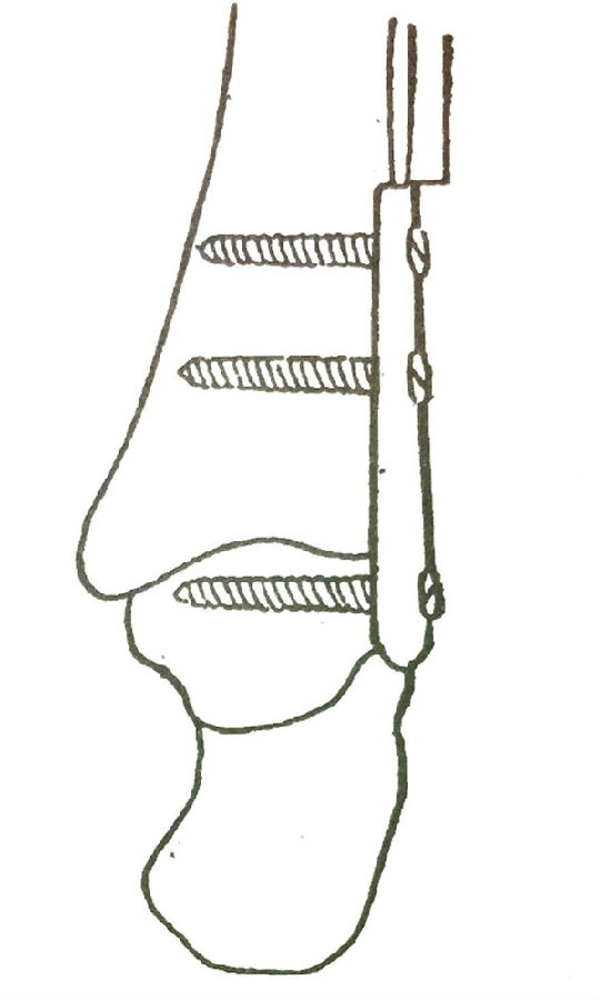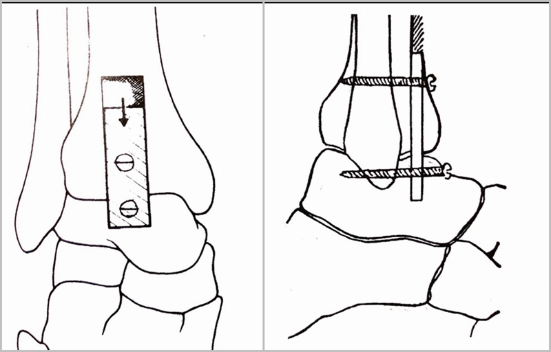 在胫骨远端外侧、距骨外侧凿浅槽,以备作为腓骨植骨之受区。腓骨相邻面凿成毛糙面,分别用螺丝钉固定,间隙植骨。或腓骨矢状面纵形劈开,腓骨外侧半作为骨板螺钉固定,腓骨内侧半截碎植骨。