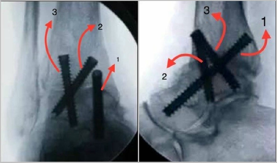 第二枚打入内侧近端螺钉,向后进入距骨体。