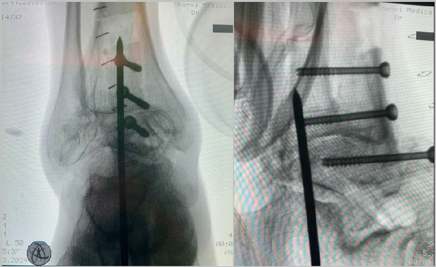 3. 导针引导下置入6.5-8.0mm空心钉固定,置入3枚,第一枚螺钉起自胫骨后外侧,远端至距骨头颈区域 。