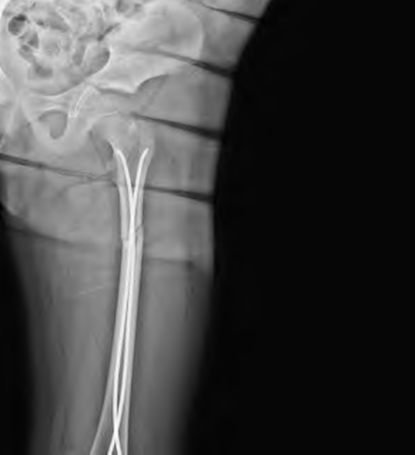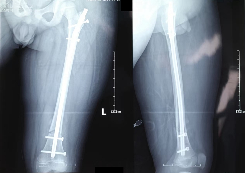 4.带锁髓内钉内固定:儿童股骨干骨折治疗的指南认为年龄大于10岁、体重大于49Kg的患儿建议使用带锁髓内钉。临床上对于大龄、大体重儿童股骨干骨折采用青少年股骨外侧髓内钉或带锁髓内钉内固定治疗,可取得良好的疗效,且安全性高。髓内钉内固定治疗也是一种微创手术方式,骨折断端一般不需要切口或做一小切口,就可达到解剖复位,带锁后可控制旋转,可以早期进行功能锻炼,对髋膝关节的活动影响较小。该方法也存在不足,有些病例会伴有股骨头坏死、髋外翻畸形和股骨颈狭窄等并发症。由于常常需要扩髓,导致髓内结构的遭到破坏,带锁引起骨折端应力遮挡,继而出现延迟愈合与不愈合,而最严重的并发症为股骨头缺血性坏死,虽然其发生率低,但这是影响其在临床广泛使用的原因,也是临床最严重的并发症。所以对于骨骼未成熟青少年,不推荐使用交锁髓内钉。但是也有学者治疗青少年股骨干骨折选用青少年型带锁髓内钉时,经大转子外侧进针,在短期内对股骨头血运、股骨近端骨骺发育和髋关节功能不会造成影响。