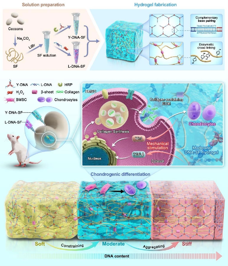 骨关节炎(OA)是一种常见关节疾病,以软骨退变为主要特征,发病率高、致残率高,给个人和社会带来巨大负担。然而,由于软骨再生机制尚不清楚,软骨再生修复一直是临床治疗难题。基于此,团队首次将DNA与丝素蛋白结合在一起制备了具备可控表面刚度的双网络DNA-丝素蛋白水凝胶用于调控干细胞成软骨分化。其中,DNA通过碱基互补配对形成DNA超分子网络,诱导SF分子形成β-折叠进而调控水凝胶表面刚度;此外,实验表明具备适中表面刚度双网络DNA-丝素蛋白水凝胶利于BMSCs成软骨分化。具备适中表面刚度双网络DNA-丝素蛋白水凝胶可以上调BMSCs Wnt信号通路和TGF-β信号通路,促进含胶原的细胞外基质分泌,加速关节软骨缺损修复。