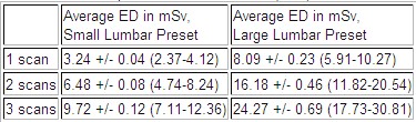 小体型患者单纯用O形臂进行CT扫描的辐射剂量为3.24±0.04 mSV(误差范围2.37-4.12 mSv),大体型患者为8.09±0.23 mSV(误差范围5.91-10.27mSv)。这些剂量低于以往报道的腹部CT扫描标准有效剂量(10-20 mSv)。尤其对于小体型的患者,一次标准腹部CT的有效辐射剂量约相当于2-3次这样的扫描产生的剂量(表1)。