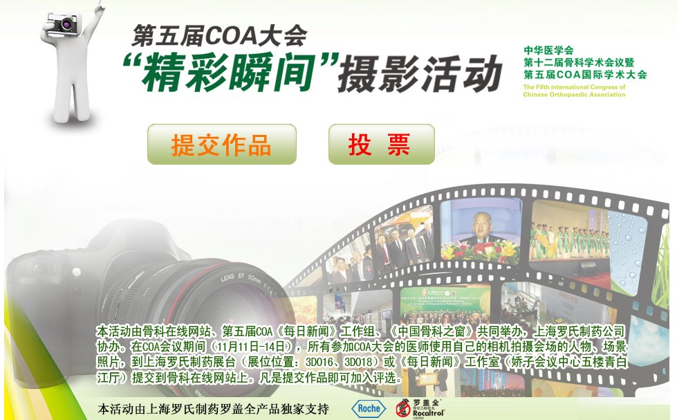 第五届COA大会期间,骨科在线、COA《每日新闻》工作组开展了“第五届COA大会精彩瞬间摄影作品评选活动“,本次活动在COA大会上吸引了众多骨科医师参与,网上收到很多优秀作品,及大家踊跃在现场投票。COA大会结束后将继续开通网上递交作品和投票活动(截止到2010年12月30日)。优秀作品将获得惊喜大奖。详情请点击http://www.orthonline.com.cn/paike-index