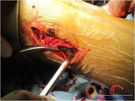 图2内踝处指骨钢板及外踝处肌腱线打结及打结后绳结包埋情况