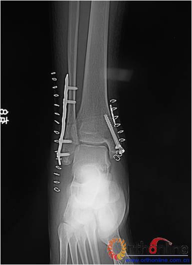 术后患肢无负重石膏固定4周,术后6周开始适度被动功能锻炼,术后8周可下地活动。术后6个月行双侧踝关节影像学检查,确认下胫腓间隙是否增宽。术后1年,骨折愈合后,取出内固定器材(一般时间为1年)。