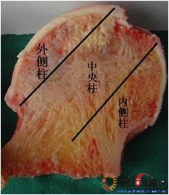 图1 股骨头冠状面三柱结构:外侧柱占30%,中央柱占40%,内侧柱占30%