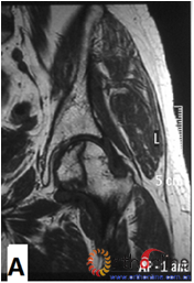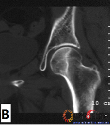 Fig 2 According to preservation of the lateral pillar, the necrosis was divided into three types. (Fig 2-1)Type Ⅰ: Whole lateral pillar preserved (A) MRI showing; (B) no collapse occurred seven years later by CT showing. (Fig 2-2)Type Ⅱ: Preservation of the partial lateral pillar, (A) MRI showed the preservation of the lateral cortical bone; (B) no collapse of the femoral head four years by CT. (Fig 2-3)Type Ⅲ: the necrotic line pass through the cortical bone and bone morrow ;(A) MRI showed the necrotic line; (B) collapse of the femoral head occurred two year later.