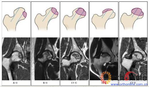 Fig.4 Schematic diagram and MRI of China-Japan Friendship Hospital (CJFH) classification for osteonecrosis of the femoral head based on three pillars. Type A: the necrosis involved the medial pillar. Type B: the necrosis involved both medial and central pillars. Type C1: the necrosis involved the three pillars but the partial lateral pillar preserved. Type C2: the necrosis occupied all lateral pillar and partial central pillar. Type C3: the necrosis involved the three pillars including the cortical bone and marrow.