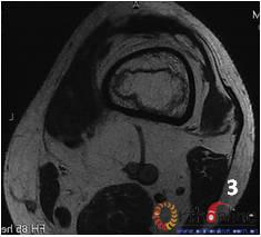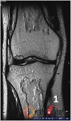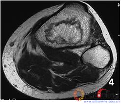 Fig 2 Male, 40 year-old, steroid-associated the bone infarction, MRI showed necrosis involved only in bone marrow, the cortical bone was preserved: (1) the coronal image of diaphysis of femur and tibia;(2) the saggital image of femur and tibia; (3) Transverse section of femur; (4) Transverse section of tibia