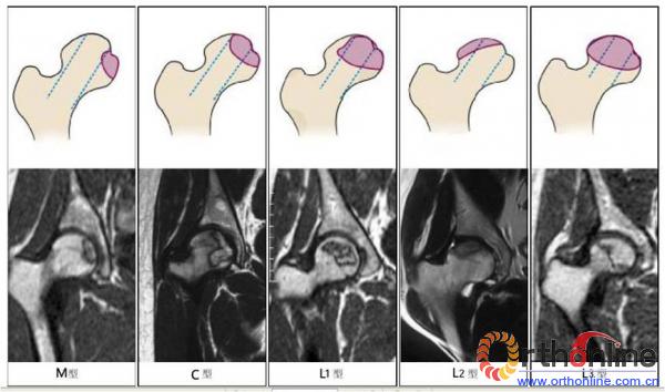 结果 中日友好医院对股骨头坏死共分5型,及内侧型(M型):坏死灶占据内侧柱;中央型(C型):坏死灶占据中央柱;外侧型(L型):坏死灶占据内、中、外三柱。依据坏死灶占据外侧柱的不同情况,又将外侧型分为次外侧型(L1型):部分外侧柱被坏死灶占据,部分外侧柱存留(至少应保存外侧皮质);极外侧型(L2型):坏死灶占据外侧柱和部分中央柱,部分中央柱和内侧柱存留;全股骨头型(L3型):坏死带贯穿股骨头三柱,包括外侧皮质。回顾性研究显示中日友好医院分型无论在股骨头塌陷判断还是疗效判断均优于日本分型。