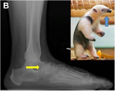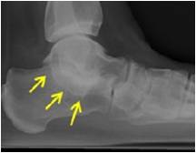 放射学特征:跟距联合在侧位X线片上呈现C sign,跟舟联合在侧位X线片上呈现食蚁兽鼻征 拍摄45°内斜位X片观察跟舟联合。跟骨轴位(Harris and beath): 跟骨轴位X线片观察跟距联合。