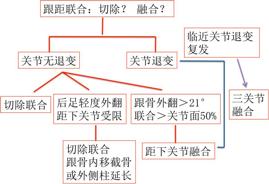 选择手术方式时应考虑的因素:患者年龄,联合大小 ,跟骨外翻程度,距骨突起,距下关节或周围关节退变等情况。对距下关节无退变者,可行联合切除,如合并后足轻度外翻,距下关节活动受限,需加行跟骨内移截骨或外侧柱延长。如跟骨外翻超过21°或联合大于关节面的50%,或距下关节已退变则需行距下关节融合术。如联合周围关节也出现退变,则需行三关节融合术。