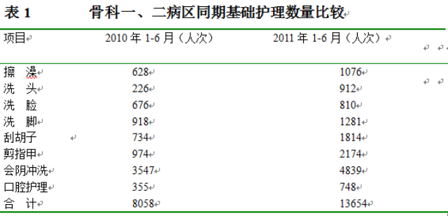 1.3.2骨科收治量大,卧床病人多,一直以来,人员缺乏是影响基础护理质量因素之一,在护理部及科室领导的支持下,将补齐护理人员编制当作首要问题,仅仅2010-2011年上半年骨科新引进护理人员66人,使床护比达到1:0.4的要求。在人员上确保确保了工作的开展。